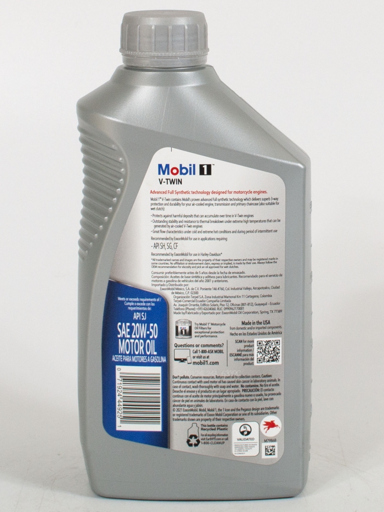 Mobil 1 V TWIN SAE 20W-50- моторное масло предназначено для мотоциклов с сухим сцеплением и сцеплением в масляной ванне. Разработано с целью обеспечить защиту для 4-х тактных двигателей V-twin, особенно с водяным охлаждением. Отличается высокой защитой от коррозии и износа, высокой стабильностью к сдвигу, низким расходом масла на угар и испарение. Не содержит полимерных загустителей. Обеспечивает плавную работу и продлевая ресурс двигателя.
